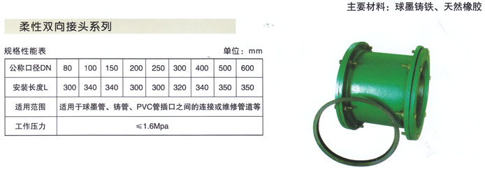 柔性双向接头适用于球墨管、铸管、PVC管插口之间的连接或维修管道等。柔性双向接头采用球墨铸铁、   橡胶为主要材料。柔性双向接头密封性好,承受压力大、安装操作方便等特点是理想的连接管道产品。